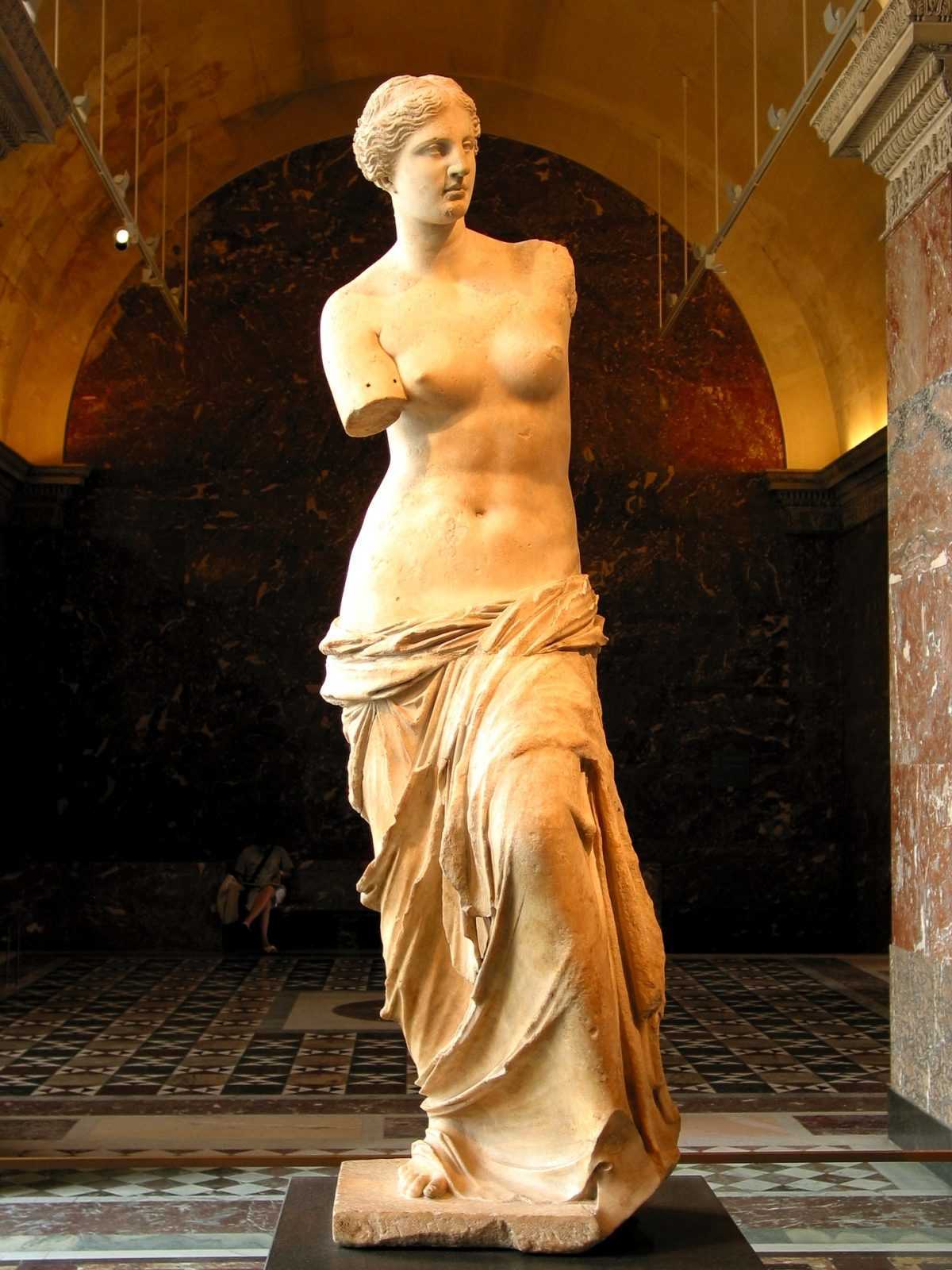 У этой мраморной древнегреческой богини любви Афродиты есть голова на плечах, в отличие от Ники, а вот с руками та же проблема – их просто нет. Правда, лишилась конечностей она уже после того, как ее нашли на острове Милос в Эгейском море в 1820 г., когда поспорили французы, желавшие вывезти ее с острова, и турки, которым принадлежал остров, и которые не желали расставаться с найденным сокровищем.