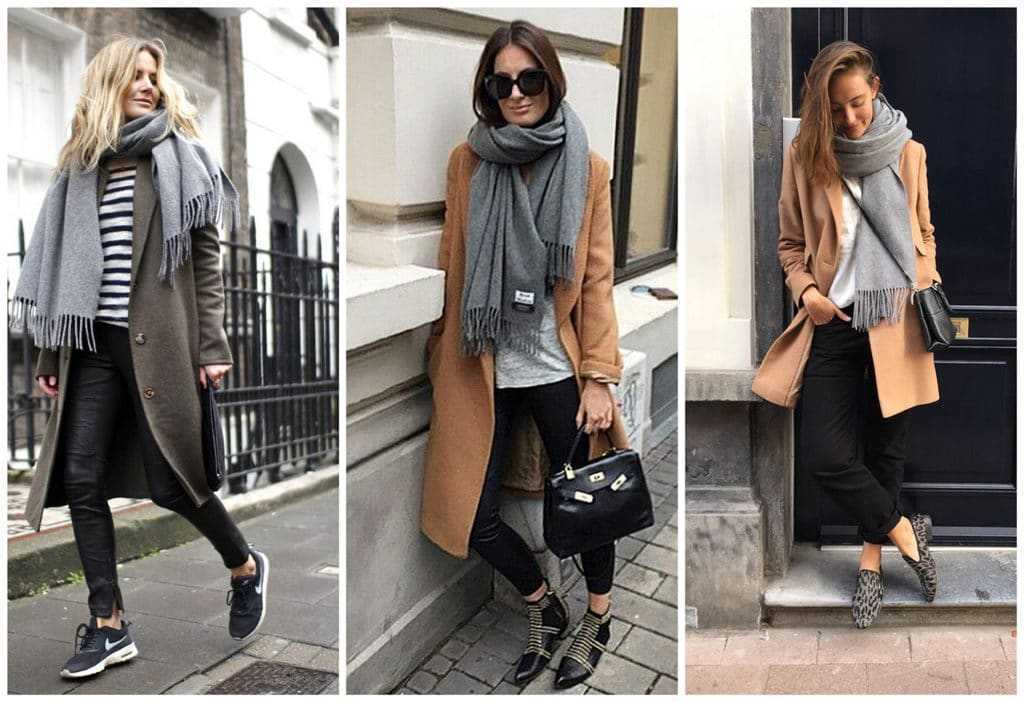 Если вы планируете носить пальто в расстегнутом виде, тогда шарф может быть ярким и должен сочетаться с базовыми вещами или дополнять их.