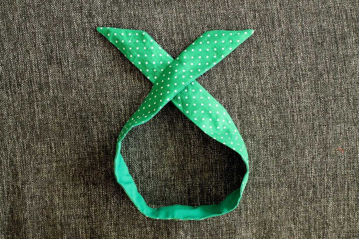 В итоге должна получиться длинная повязка на голову с зауженными кончиками и резинкой в середине. Из ушек солохи можно завязывать банты, красивые узлы, цветы.