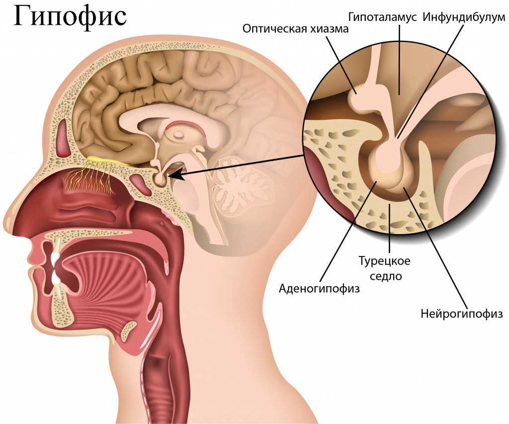 Гипофиз – это небольшая железа, вырабатывающая гормоны – вещества, которые поступают в кровоток, вместе с ним распространяются по всему телу и сообщают различным тканям, как им нужно действовать – работать или отдыхать, выделять что-то или поглощать. Она напрямую связана с расположенным рядом гипоталамусом – частью мозга. Вместе они контролируют работу эндокринной системы – всех желез в организме.