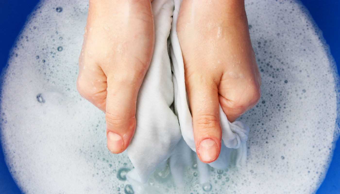 Если футболка из деликатной ткани или синтетики, можно постирать изделие вручную. Такой способ подойдет также для удаления свежих пятен. Стирать следует в растворе порошка или отбеливателя. Тонкую майку можно натереть хозяйственным мылом и прополоскать под краном.