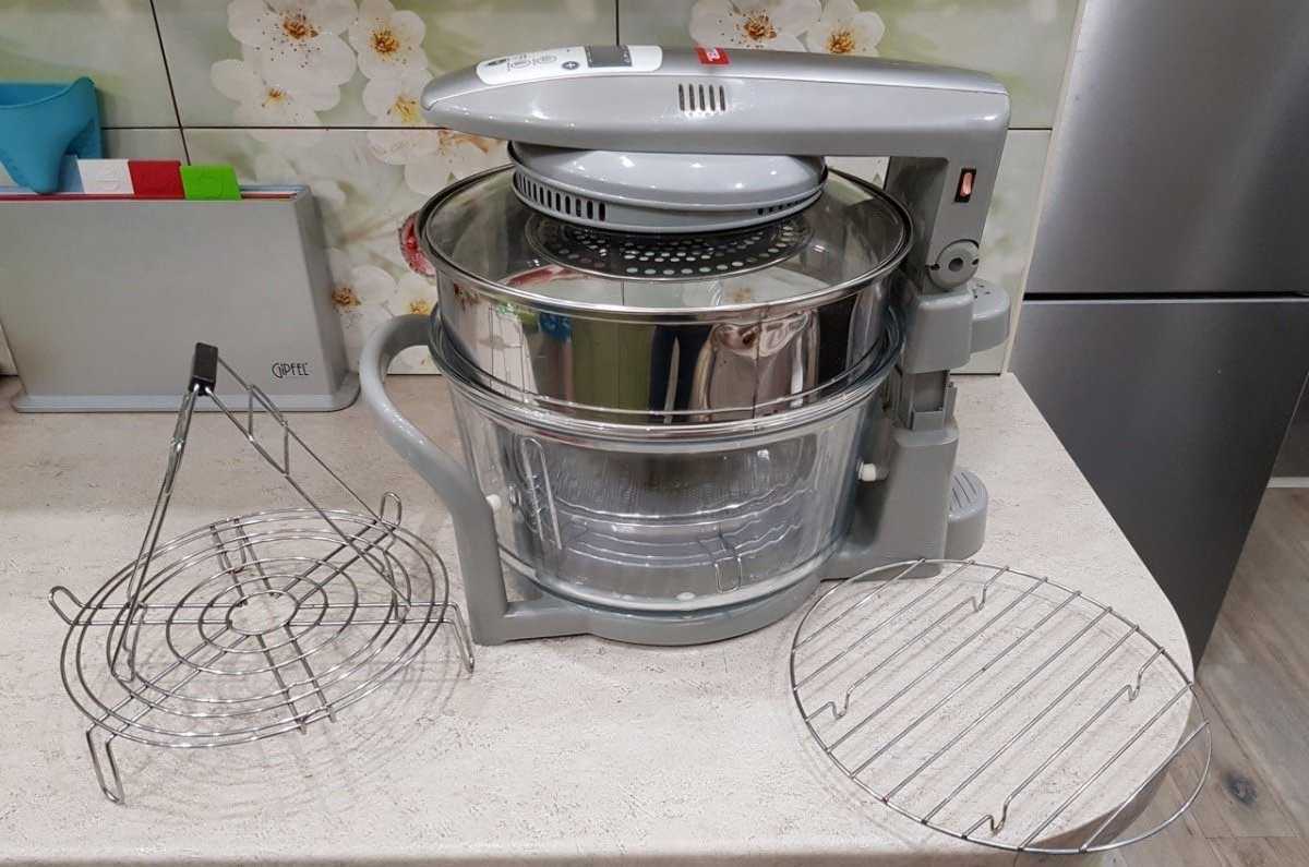 Основное удобство аэрогриля – его универсальность. Прибор прост в пользовании, пища готовится быстрее, чем на обычной газовой или электрической плите. Нет необходимости в постоянном контроле. Во избежание ожогов нельзя открывать крышку во время процесса приготовления пищи, прикасаться к колбе. Не используйте деревянную или пластиковую посуду. Аккуратно ухаживайте за прибором, очищайте от брызг жира, насухо вытирайте и просушивайте его. Все ремонтные работы проводите только в сервисном центре.